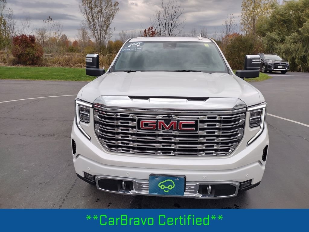 2024 GMC Sierra 1500 Denali White Frost Tricoat 15/19 City/Highway MPG 10-Speed Automatic, 4WD, Jet Black w/Forge Perforated Leather Seat Trim, 120-Volt Bed Mounted Power Outlet, 120-Volt Interior Power Outlet, 170 Amp Alternator, 2 Charge/Data USB Ports Inside Center Console, 2 Type-C Charge-Only Rear USB Ports, 2 USB Ports, Auto-Locking Rear Differential, Auxiliary External Transmission Oil Cooler, Bed View Camera, Chrome Header w/Signature Denali Chrome Grille, Chrome Recovery Hooks, Chrome Wheel To Wheel Assist Steps, Color-Keyed Carpeting Floor Covering, Deep-Tinted Glass, Denali Reserve Package, Electric Rear-Window Defogger, Floor-Mounted Center Console, Front Rain-Sensing Wipers, GMC Connected Access Capable, GMC MultiPro Power Steps, HD Surround Vision, Heated 2nd Row Outboard Seats, Heated Driver & Front Outboard Passenger Seating, Heavy-Duty Air Filter, Hill Descent Control, Hitch Guidance, Hitch View, In-Vehicle Trailering System App, Integrated Trailer Brake Controller, Keyless Open & Start, LED Cargo Area Lighting, Multicolor 15 Diagonal Head-Up Display, OnStar & GMC Connected Services Capable, Perimeter Lighting, Power Door Locks, Power Front Passenger Windows w/Express Up/Down, Power Front Windows w/Driver Express Up/Down, Power Rake & Telescoping Steering Column, Power Rear Windows w/Express Down, Power Sliding Rear Window w/Rear Defogger, Power Sunroof, Preferred Equipment Group 5SA, Premium Bose 7-Speaker Sound System, Push Button Start, Rear Camera Mirror, Rear Cross Traffic Braking, Rear Pedestrian Detection, Rear Wheelhouse Liners, Remote Vehicle Starter System, SiriusXM w/360L, Spray-On Pickup Bedliner w/Denali Logo, Steering Wheel Audio Controls, Technology Package, Theft Deterrent System (Unauthorized Entry), Trailer Camera Provisions, Trailer Side Blind Zone Alert, Trailering Package, Ultrasonic Front & Rear Park Assist, Universal Home Remote, Ventilated Driver & Front Passenger Seats, Wheel Locks (Set of 4) (LPO), Wheels: 22 x 9 Painted Aluminum, Wi-Fi Hotspot Capable, Wireless Charging. Odometer is 5133 miles below market average! We have over 55 Years of Experience Serving WNY & all over the United States. Certified.
